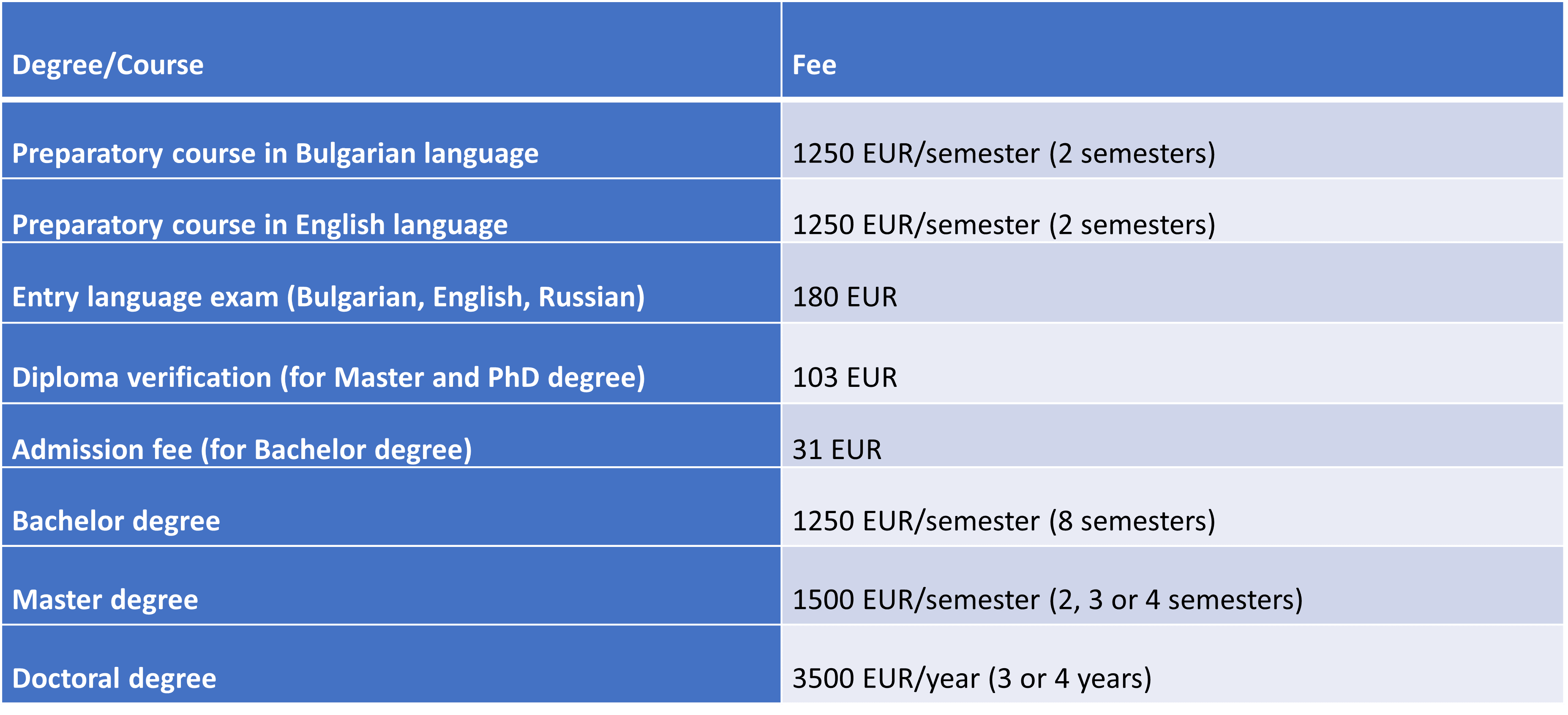 Yıllık ücret 2 500 € ‘dur. Ücret, her dönem başlamadan önce her biri 1.250 € tutarında iki eşit taksitte ödenir.